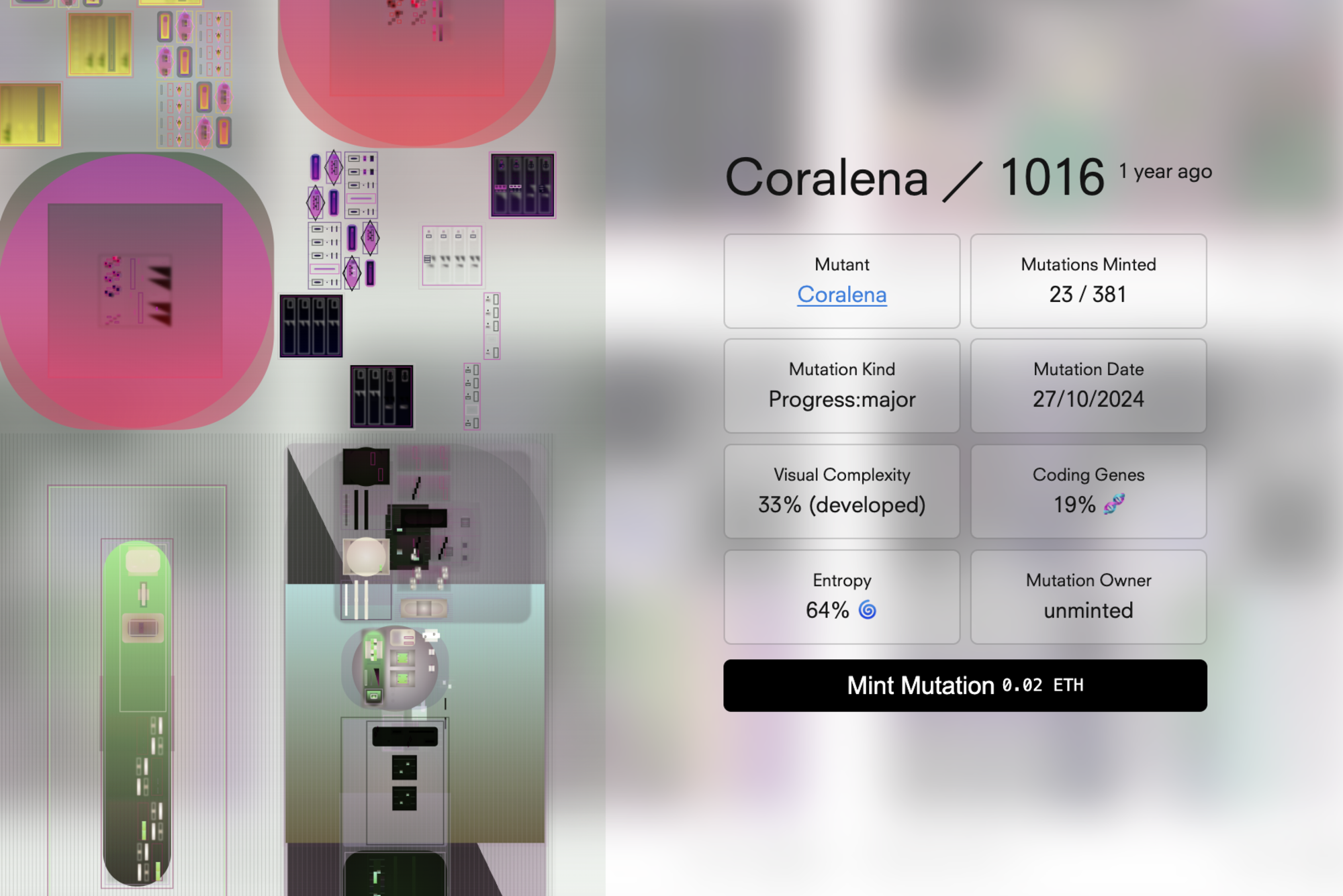 A new open-ended Ethereum ERC721 collection containing minted mutations. One token represents one static mutation. These tokens do not mutate further but are snapshots in time. The metadata of these tokens is stored on-chain and the mutation state images (SVG) on Arweave.