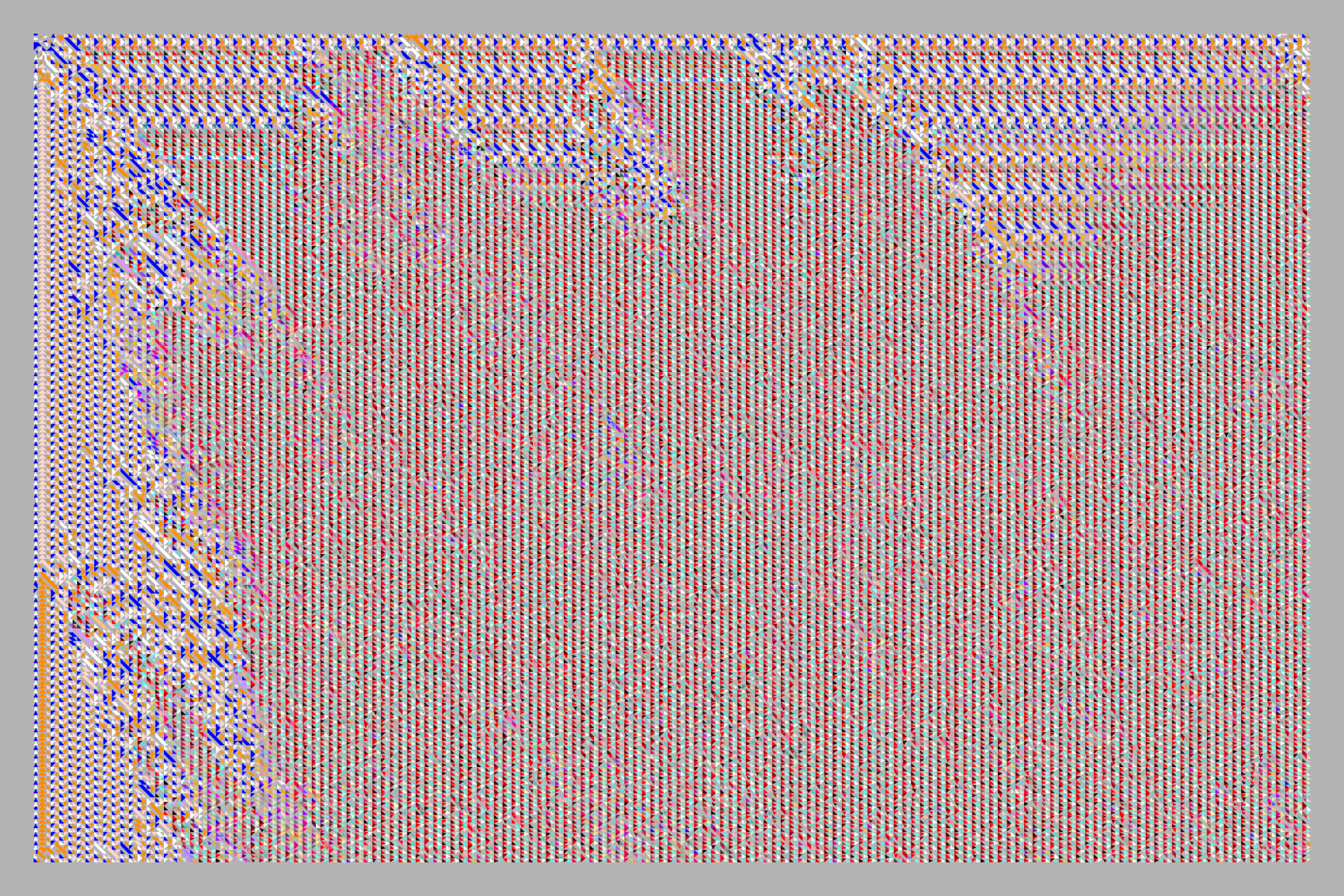 The exhibition brings together a body of generative animations built upon a cellular automaton in the tradition of Conway's Game of Life, where a minimal set of rules gives rise to extraordinary complexity, and where death is not failure but the system's natural feature. Alongside the screen-based works, the exhibition also includes a series of plotter drawings on paper — tracing the same generative logic into an anachronistic register.
